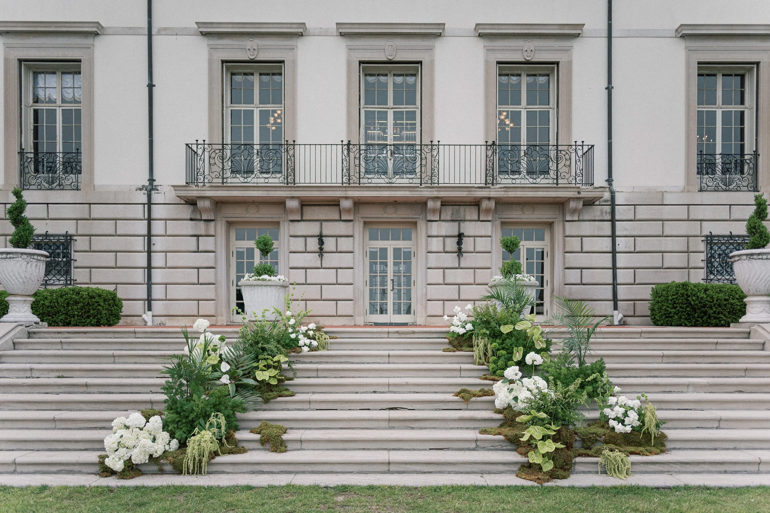 Fireplace with two floral arrangements installed for a wedding at Belle Isle Boat House in Detroit, Michigan